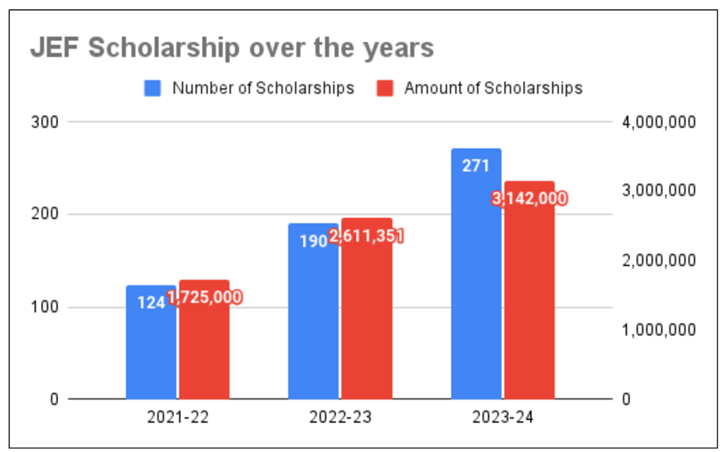 In the last three years, JEF has awarded scholarships worth Rs. 75 Lakhs to over 605 children through the help of various donors